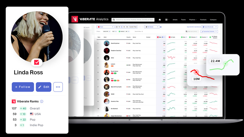 Monitoring over 1M+ artists, Viberate translates performance across streaming platforms, social media, and other channels into actionable information. The platform specializes in analytics for channels like Spotify and TikTok, offering data-infused charts and tools essential for discovering talent. Viberate’s approach is holistic: “Our approach involves a comprehensive mapping and analysis of the music industry’s ecosystem, encompassing everything from artists and songs to festivals, collections, and record labels, all centralized in a singular location.” By transforming streaming and social media insights into useful insights, they equip users to identify new artists, manage their rosters, strategize promotional efforts, and compile effective business reports.