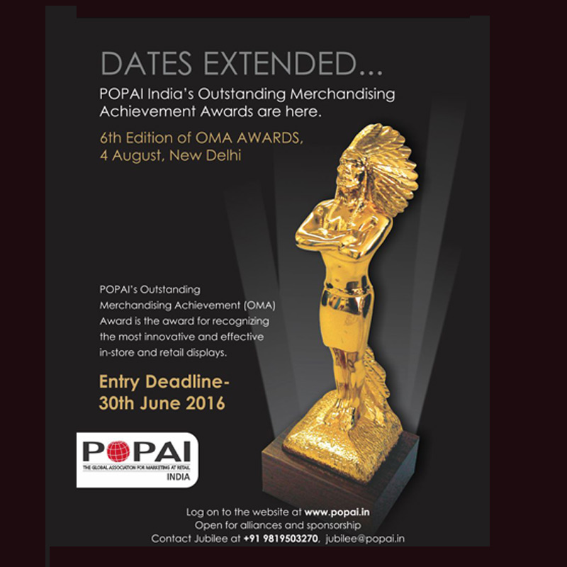 MUMBAI: Point of Purchase Advertising International (POPAI) India, the global association for marketing-at-retail,is to hold the 6th edition of Outstanding Merchandising Achievement (OMA)Awards on 4th August, 2016, at New Delhi’s Pragati Maidan. The prestigious OMA Awards worldwide has trekked over 55 years and recognises the most innovative, engaging, and effective displays at retail.