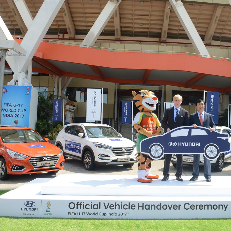 At an official handover ceremony at Jawahar Lal Nehru Stadium in New Delhi, HMIL MD and CEO YK Koo handed over the fleet of premium Hyundai cars to FIFA marketing operations group leader Martin Nussbaumer and Local Organising Committee tournament director Javier Ceppi.