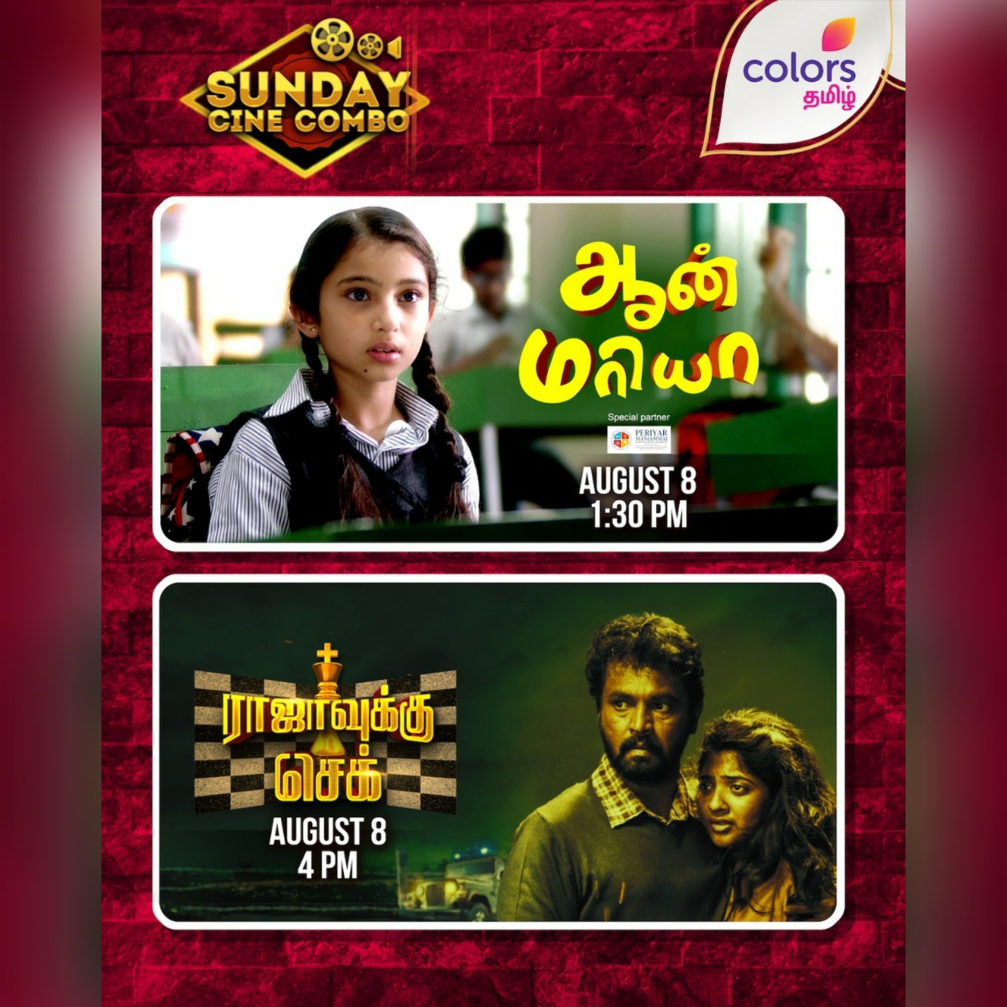 Mumbai: Regional GEC Colors Tamil is all set for the world television premiere of ‘Annmariya’ and ‘Rajavukku Check’ on 8 August at 1:30 pm and 4 pm. The upcoming premiere is a part of the channel’s popular Sunday Cine Combo programming.