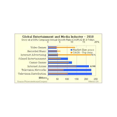 Filmed Entertainment – Spending worldwide will be fueled by strong box office receipts, boosted by the expansion of local productions. DVDs will continue to boost the home video market, but the category will be adversely affected by piracy. The filmed entertainment segment will expand at a 5.7 per cent CAGR, increasing from $59 billion in 2001 to $79 billion in 2006.