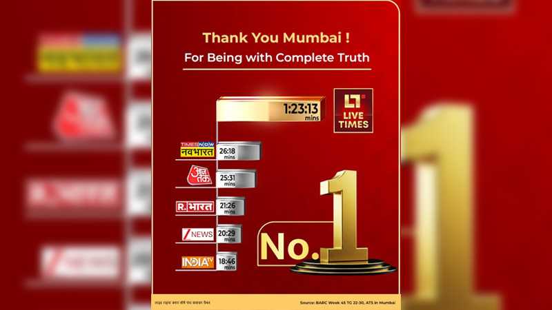 NOIDA: Live Times, India’s first global multicast news hub, has surged to the top in Mumbai, clocking a record-breaking average time spent (ATS) of 1 hour and 23 minutes, according to Barc week 45 data.’
