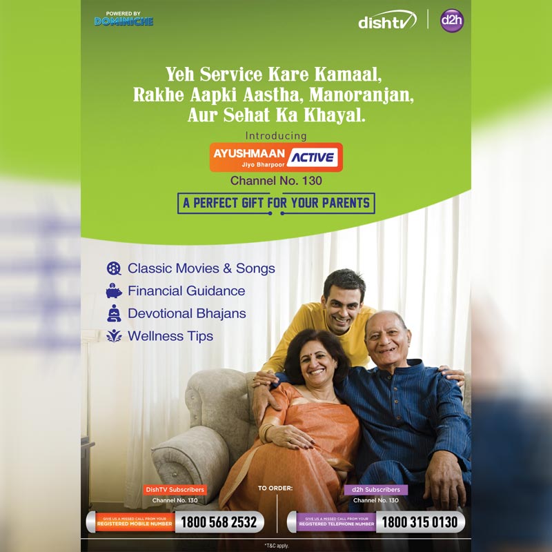 MUMBAI: Dish TV India Limited, world’s largest single-country DTH Company, introduces the first-of-its-kind value added service- ‘Ayushmaan Active’ in association with Dominiche Productions to offer unique and engaging content to the senior citizen viewers on both of its brands; DishTV and d2h. Exclusively available on both the platforms for 45 days starting July 16th, this is the first ever service dedicated to engage and motivate seniors and enjoy meaningful TV time.