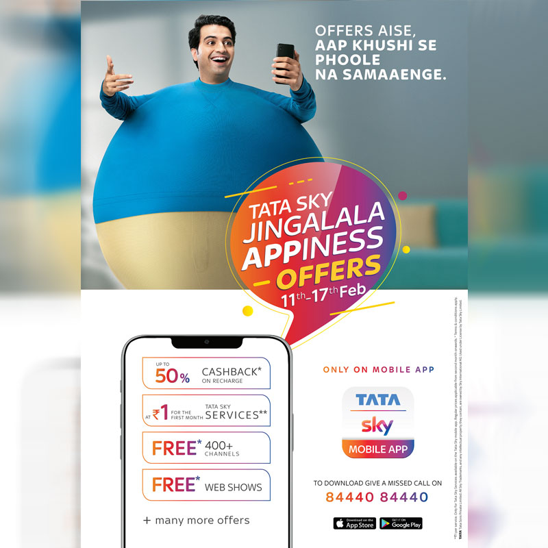 MUMBAI; Tata Sky, India’s leading content distribution platformannounces its first ever App only flash sale,‘Tata Sky JingalalaAPPiness Offers’on theTata Sky Mobile App.Establishing the mobile app as a one stop destination for both – utility and content, the weeklong offerings on the App are designed not only to elevate customer experience but also heighten entertainment bonanza like never before. With an objective to drive engagement, this initiative will serve the dual purpose of highlighting the ease of content availability and convenience of managing your Tata Sky account – anytime, anywhere.