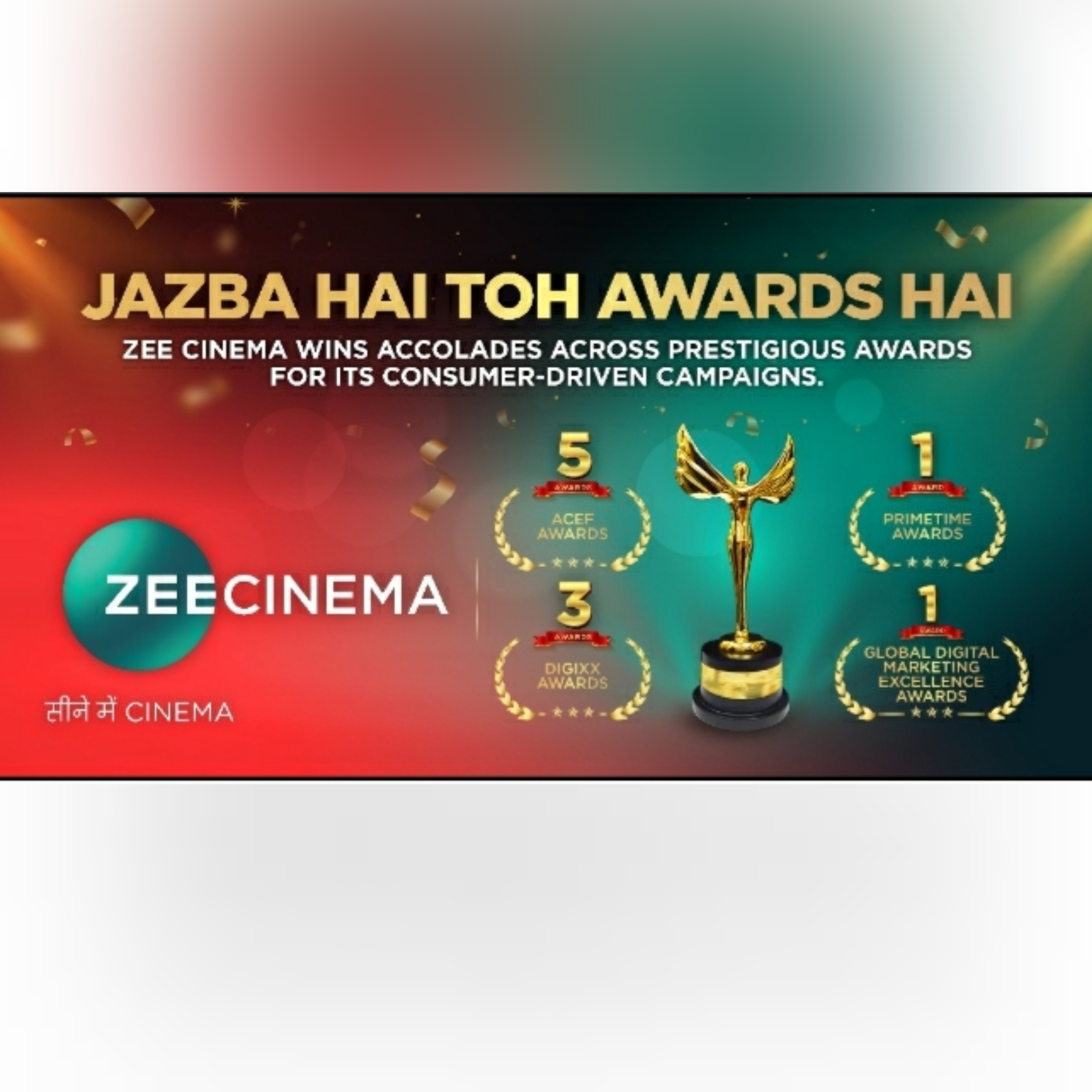 Zee Cinema, the leading Hindi Movie Channel with a strong legacy and presence in Hindi speaking markets, has proven its creative mettle once again. Known for pushing boundaries through innovation and differentiation, the channel bagged multiple awards across various categories at ACEF 10th Global Customer Engagement Forum and Awards, Global Digital Marketing Excellence Awards 2021 and Primetime Awards 2020.